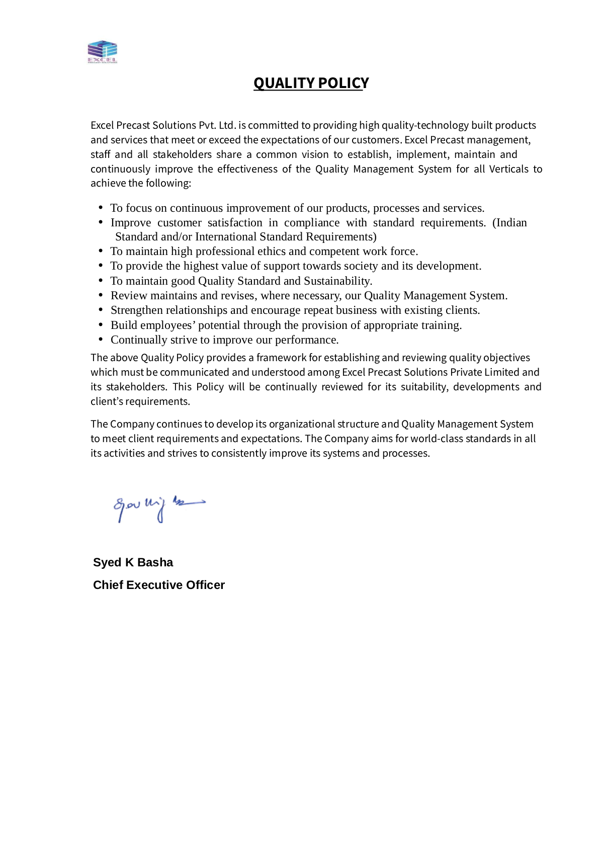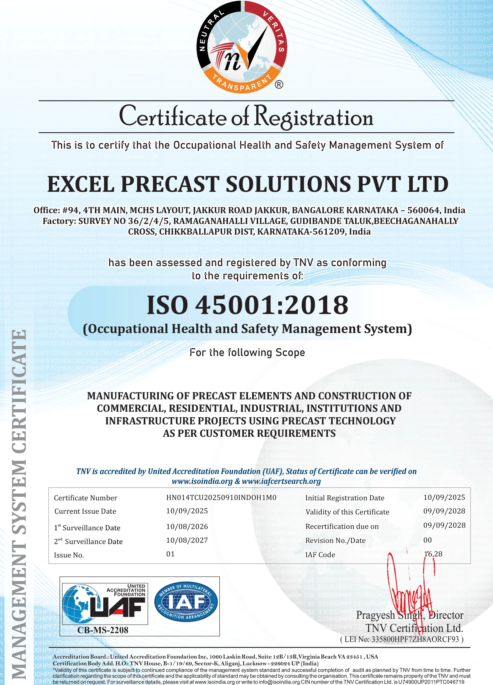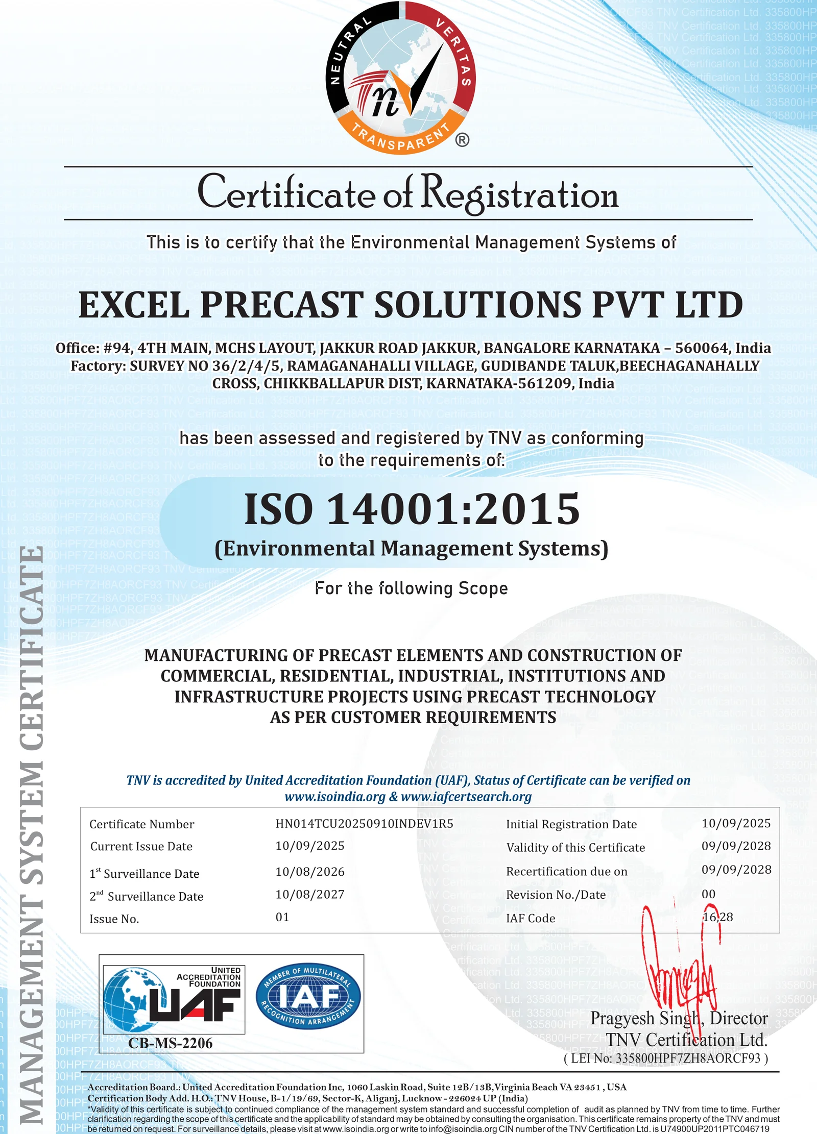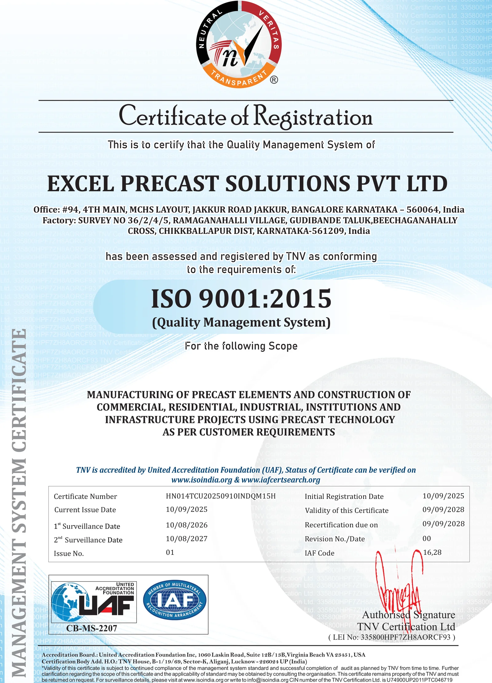 Certified for Manufacturing of Precast Elements and Construction of Commercial, Residential, Industrial, Institutional and Infrastructure Projects using Precast Technology.